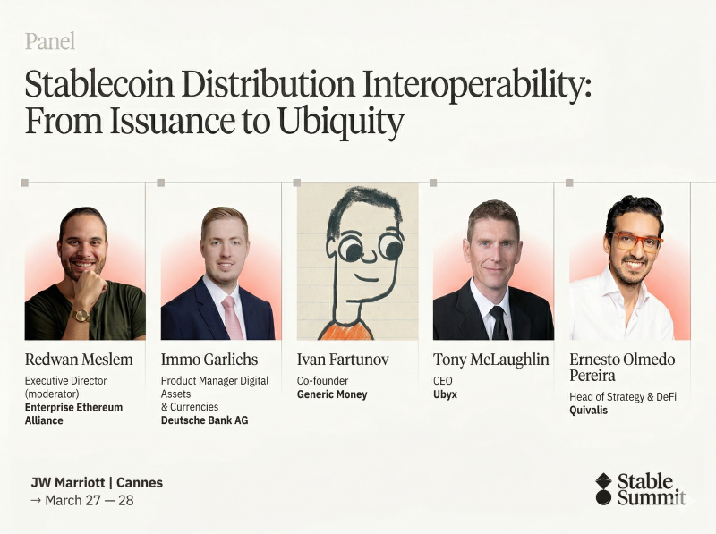 At Stable Summit IV in Cannes (27–28 March), leaders came together to examine the future of stablecoins. The panelists included Immo Garlichs (Product Manager, Digital Assets & Currencies) at Deutsche Bank AG, Ivan Fartunov (Co-Founder) of Generic Money, Tony McLaughlin (CEO) of Ubyx, and Ernesto Olmedo Pereira(Head of Strategy & DeFi) at Qivalis, alongside Redwan Meslem from the Enterprise Ethereum Alliance.